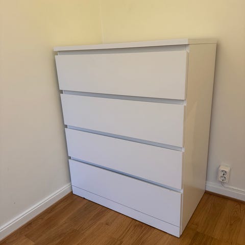 Vit byrå med 6 lådor. Kommer från Ikea.
