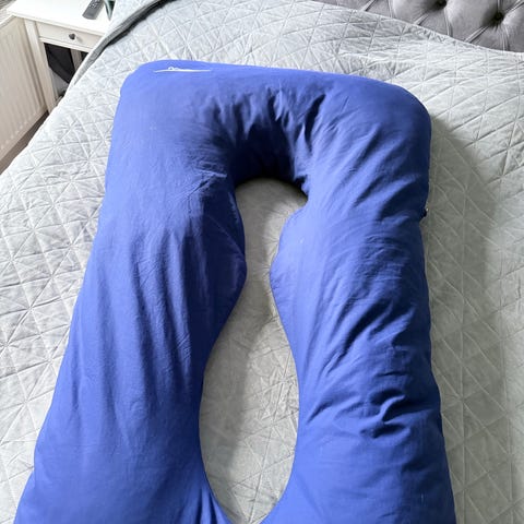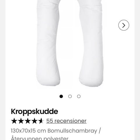 Stor, skön gravidkudde stoppas med bomull. Ej använd då jag haft en annan gravidkudde. Kudden har inget överdrag men går att tvätta hela kudden i 40 grader.