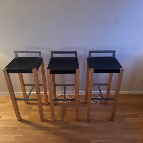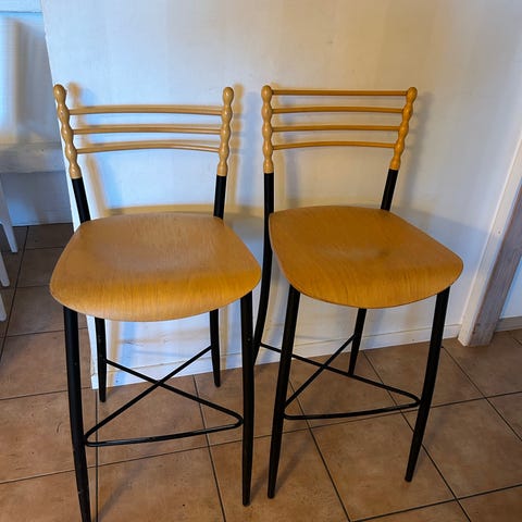 Sköna, gedigna, roterbara, äldre barstolar med ryggstöd (höjd 30 cm ca) samt fotstöd (borstad metall).