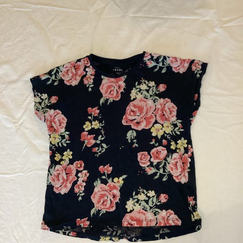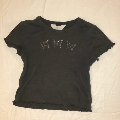 H&M T-shirt för barn i storlek 140, svart färg, tillverkad i bomull. Designad för flickor och har en tryckt fjärilsdekoration på framsidan.