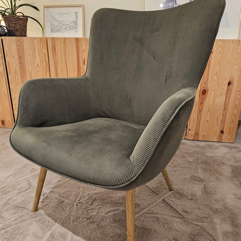 Äldre snurrfåtölj i orange manchestertyg med metallfot.