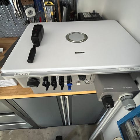 Sungrow SG10KTL-M-TL växelriktare med modellnummer SG10KTL-M-TL, avsedd för solenergisystem. Enheten är utformad för att omvandla likström från solpaneler till växelström för användning i elnät eller hushåll. Specifika tekniska detaljer finns på etiketten, inklusive elektriska anslutningar och säkerhetsstandarder.
