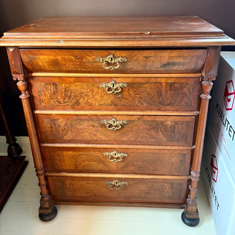 Antik byrå tillverkad i trä med dekorativa intarsia detaljer och mässingsbeslag. Möbeln har två lådor. Passar för förvaring i olika rum.
