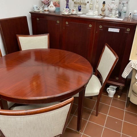 Matsalsmöbler. Bord, stolar samt bokhylla/vitrinskåp