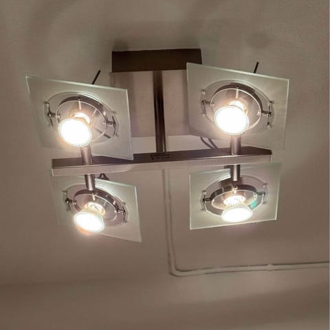 Mycket fin taklampa i trä med tre kupor i glas. Metallkåpa längst upp. Rundan kontakt