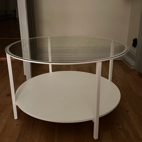 Runt soffbord med glasskiva. IKEA Vittsjö. Vit ram och underskiva. Hämtas.