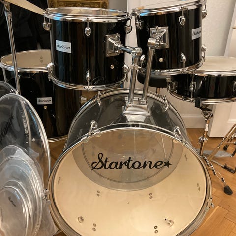 Mapex V-Serie trumset med svart finish. Inkluderar bastrumma, virveltrumma, och flera pukor. Passar för olika musikstilar och övning. Komplett med med pall. Hämtas i centrala Nynäshamn.