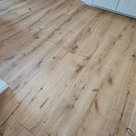 Trägolv i ek med 3-stavsmönster, tjocklek 14 mm?, totalt ca 15 kvadratmeter.