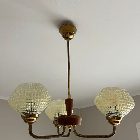 Lampan har stomme i mässing, dekorativa detaljer i teak samt kupor i pressat/strukturerat glas som ger ett behagligt och stämningsfullt ljus.