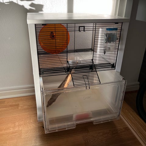 Komplett paket med allt du behöver till din hamster: Komplett bur med hus, sandlåda, mat o vand skålar, hjul som inte larmar. Extra tillbehör matskålar, litet hus i trä. Mat och snacks, massor sand, toalettsand, mjukt papperströ, vanligt strö. 2 nya transportbur, galler till att bygga lekplats, stege och extra stort hjul.