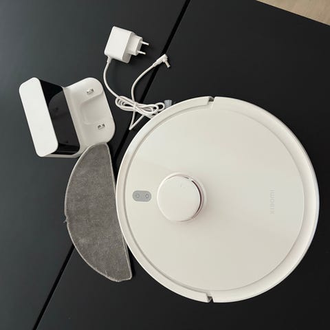 Roborock S5 max robotdammsugare. Med mopfunktion för både dammsugning och våttorkning. Levereras med laddstation och extra tillbehör för rengöring och underhåll.
