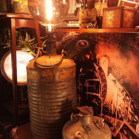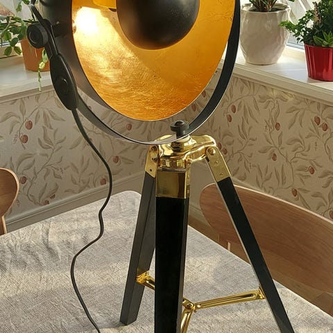 Unik bordslampa som är tillverkad av en stor bilstrålkastare från 30-40-talet av märket Bosch. Foten är en mörkbrun glaserad isolator av keramik. Perfekt för dig som gillar industristil och vill ha ett snyggt blickfång.