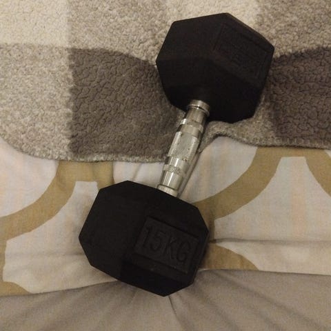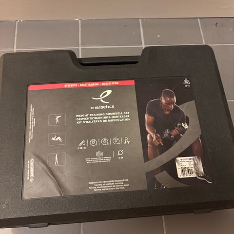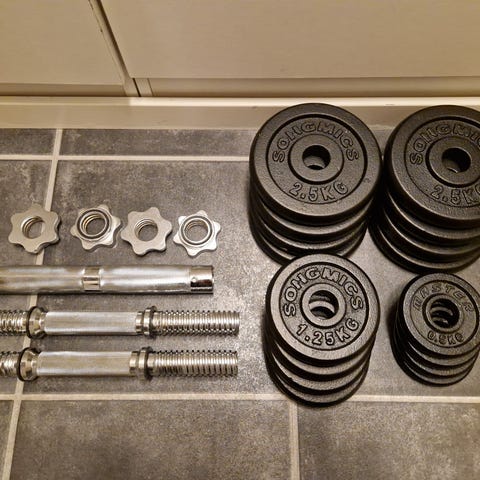 Detta hantelset är perfekt att ha till hemmaträningen. Sammanlagd vikt är 18 kg.