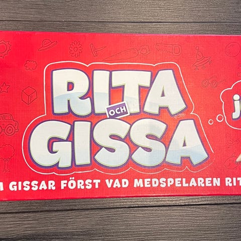 Rita & Gissa sällskapsspel med spelpjäser, tärningar, kort och block för att rita och gissa. Spelet är utformat för flera spelare och innehåller instruktioner för användning.