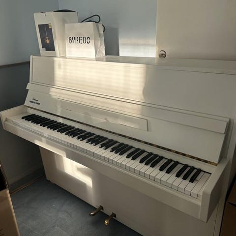 Nylund och Son Piano, vitmålat, med 88 tangenter och två pedaler. Pianot är tillverkat för att passa både nybörjare och erfarna spelare och är avsett för inomhusbruk.