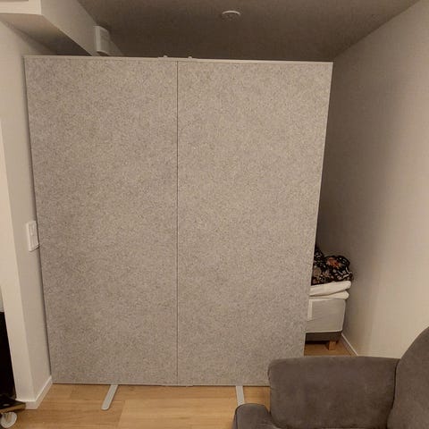Vacker och dekorativ väggskärm / rumsavdelare, vitbemålad, fyra sektioner med väggar av grått linnetyg. Praktiskt och kan vinklas till ett fyrkantigt rum eller vikas som man vill ända till endast en med alla sektioner och tar då minimalt med plats.