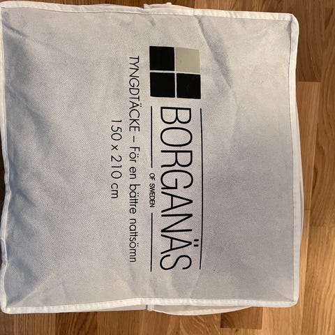 Säljer detta tyngdtäcke som är i nytt skick i princip. Måtten är 205x150 cm och väger 10 kg. Medföljs en tvättpåse, väska och bruksanvisning.
