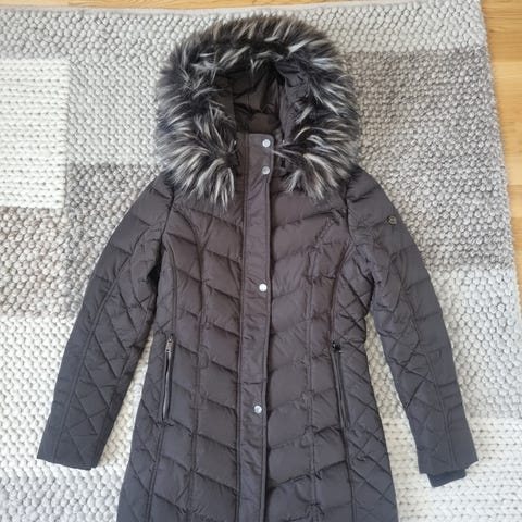 Khakifärgad jacka med 2-vägs dragkedja fram och två fickor med dragkedja. Jackan har en avtagbar huva med fuskpäls i svartgrå nyans. Pälsen går också att ta av. Dragkedjor i ärmslut samt 2 st innerfickor med dragkedja. Dun fyllning 80% och 20% fjäder.