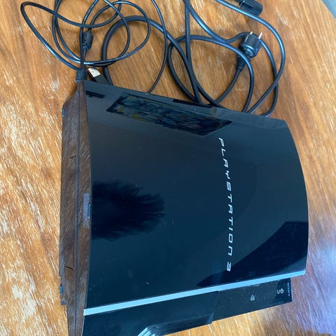 CECH-2004A spelkonsol i svart färg, 2 trådlösa handkontroller medföljer, även strömsladd, HDMI’s-sladd och en laddsladd.