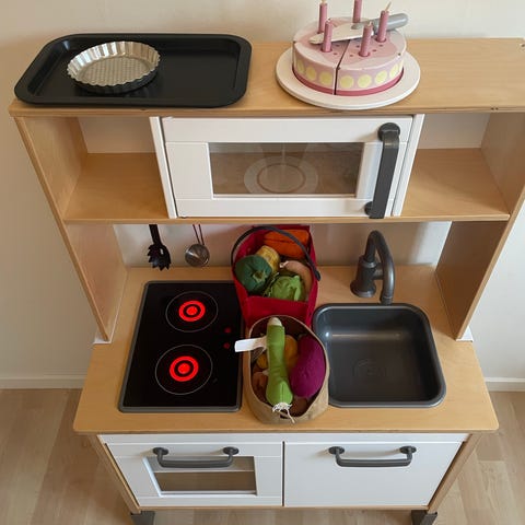 IKEA barnkök lekset med spishäll, vask och skåp i träutförande. Settet inkluderar flera köksredskap och leksaksfrukter och grönsaker i olika färger och material, anpassat för barnlek. Mycket tillbehör se bild. Mycket av tillbehören är i trä.