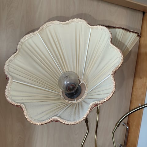 Taklampa med glaspaneler dekorerade med blommönster i orange nyanser.
