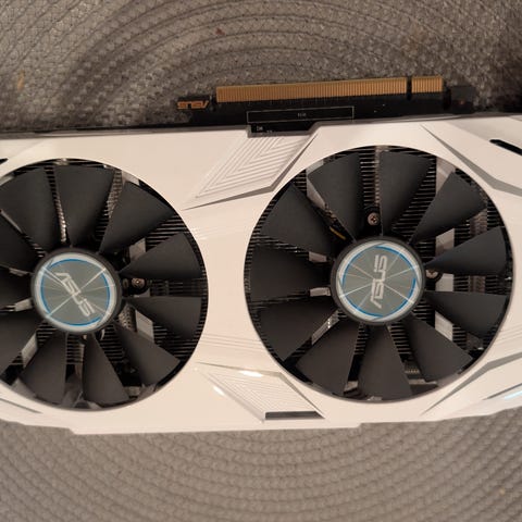 Asus grafikkort med dubbla fläktar och vit kylfläns. Grafikkortet är avsett för PC-användning och har en PCIe-anslutning. Kan skickas. Asus gtx 1060 6gb