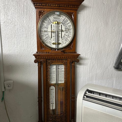 Fint bevarad antik barometer tillverkad av F.R. JOHANSSON & JOHANSSON & C:o, OPTISKA & METEOROLOGISKA INSTRUMENTMAKARE STOCKHOLM som det står på etiketten. Det långa glasröret är helt. Längd 101,5 cm, bredd ca 11 cm. Träet längst upp har smala sprickor på sidan, lite vridning på längden, men i otroligt bra skick med tanke på åldern! Jag vill gärna ha prisförslag.