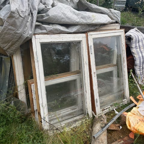 Fönster av mörket Elitfönster i trä med måtten b: 98 h: 108 cm. Fönstret är vitmålat och har en svart ram utvändigt .