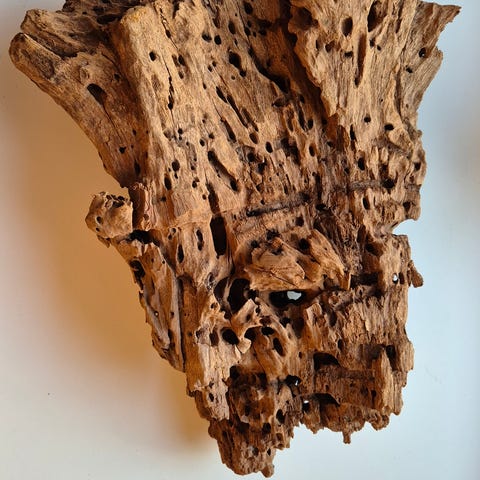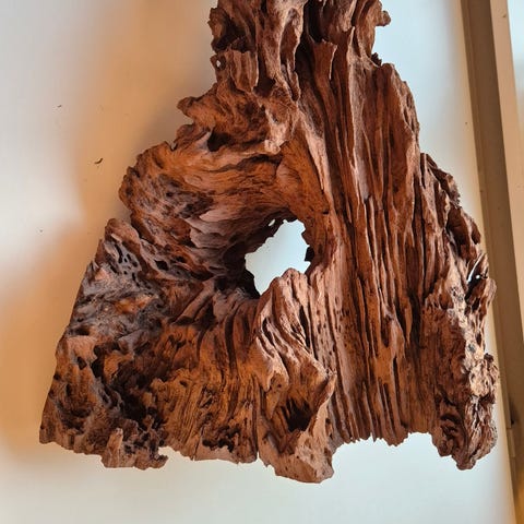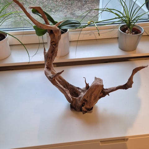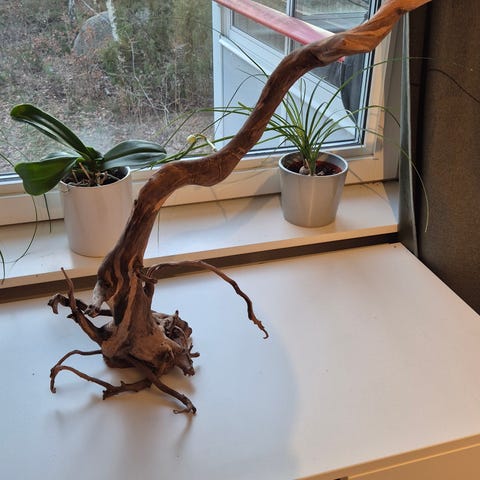 En stor rot. Påminner mycket om ett träd tycker jag. Använde den i ett terrarium innan då den satt fastankrad i fogskum (därav den svarta delen). Bestämde mig senare för att använda den som ansats för kanariefåglar i en fågelbur vilket fungerade jättebra. Den vör nog rengöras innan användning i akvarium/terrarium men annars tycker jag själv att den är superfin.