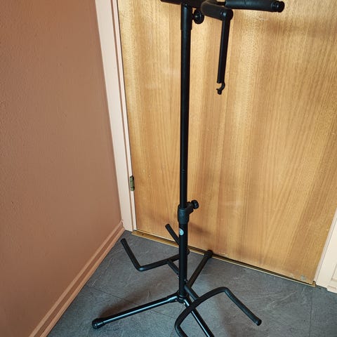Mikrofonstativ med justerbar arm och tripod-fot, lämpligt för olika höjder och positioner. Stativet är tillverkat av metall och plastmaterial, svart färg. Passar för användning med mikrofoner vid inspelning eller framträdanden.