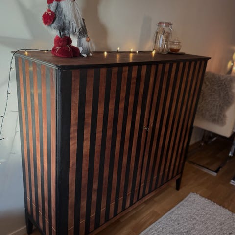 Gediget och fint linneskåp i mörkbetsad björk/alm. Lådor innanför ena dörren. Nyckel finns. En liten färgskiftning på toppskivan se bilder.