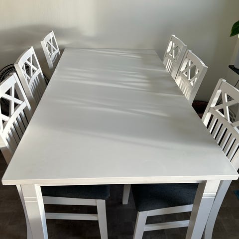 Robust matbord,6 st vita stolar och massa tillbehör.