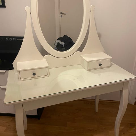 IKEA MALM sminkbord i vit färg med måtten 120,3 cm i bredd, 77,4 cm i höjd och 41 cm i djup. Skrivbordet har en utdragbar låda med måtten 106 cm i bredd, 33,8 cm i djup och 7,1 cm i höjd. Fint skick!