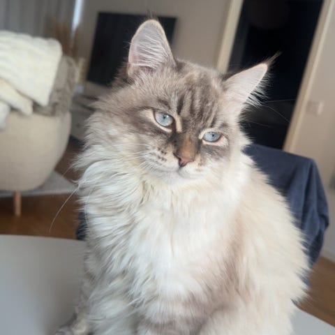 Hon är en trevlig, snäll ,busig katt. Går på lådan äter Royal Canin, van att klippa klorna och bli klappad.