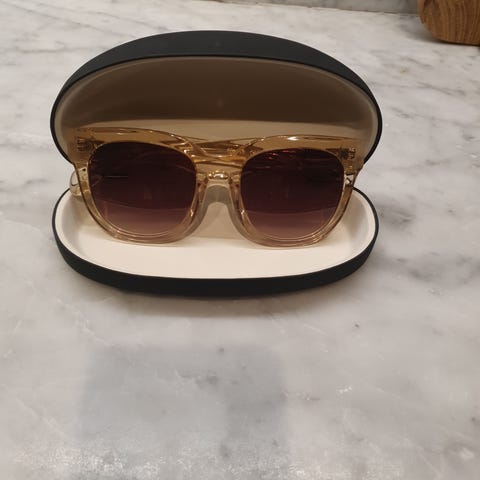 Corlin Monza solglasögon för dam i brun färg. Glasögonen har en fyrkantig båge och medföljande fodral och påse i matchande färg. Glaset är lite mörk lila ton .