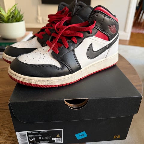 Nike Jordan 1's i storlek 40.5. Skorna har en kombination av lila, svart och vitt i designen. De är tillverkade av material som inkluderar läder och textil. Skick enligt bilder. Original kartong samt extra snören medföljer.