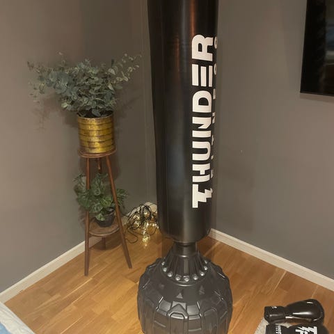Thunder Fitness boxningssäck med tillhörande handskar i svart färg.