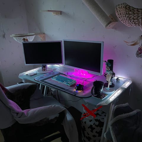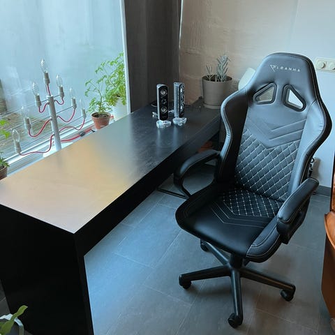 Gamer skrivbord med svart och kolfiber utseende. Mycket snyggt och coolt att ha i sitt rum. Står stabilt och rakt. Minimal slitage. Finns hål där man kan trä i kablarna. Även en del där man kan hänga sina hörlurar. Billigt pris då jag vill bli av med den.