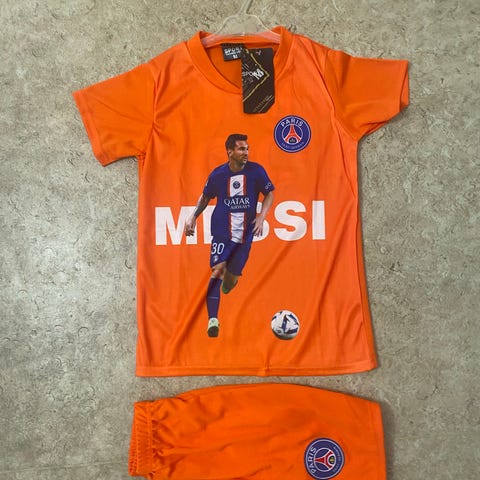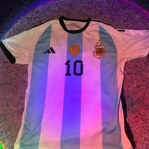 Adidas Messi Argentina fotbollströja och shorts i barnstorlek. Tröjan är vit med ljusblå ränder och har nummer 10 samt namnet Messi på ryggen. Shorts är svarta med blå detaljer. Setet är avsett för barn.