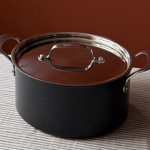 Tefal Jamie Oliver gryta med lock, anpassad för induktionshäll. Grytan har handtag på båda sidor och ett glaslock med handtag. Materialet är lämpligt för olika typer av matlagning och passar för användning på induktionshällar.
