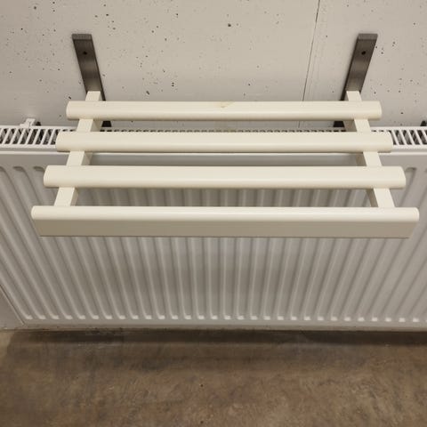 Säljer en stilren och stabil vit hatthylla i trä med klassiskt kryssmönster.