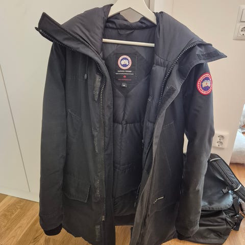 Navy blå Canada Goose jacka, varm och härlig! Säljes då den inte passar längre. Använd två säsonger men jackan är utan slitage, dock finns ett fåtal småfläckar som syns tex vid ena ärmslutet. De var obehandlad när bilden togs men kommer självklart att tas bort vid försäljning.