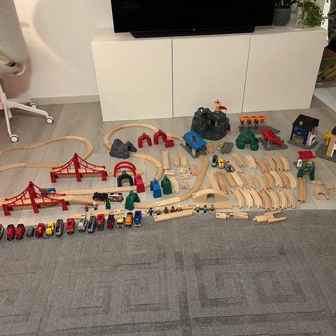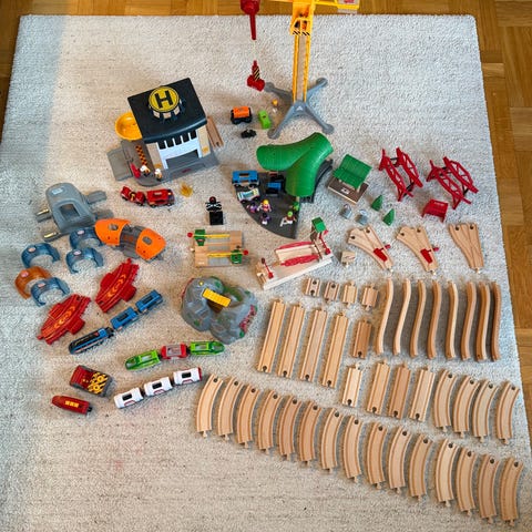 Tunnelbana, tågbanor (svängar, raka) broar, bilar, tåg, figurer, byggnader, djur, etc. En hel del brio som gör en unge glad