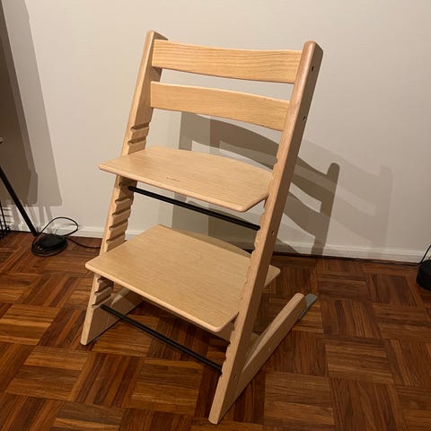 Stolen är fint skick, har justerbar sitt- och fotplatta för anpassning efter barnets storlek. Något skavmärke men i bra skick. Finns i Västberga, hägersten.