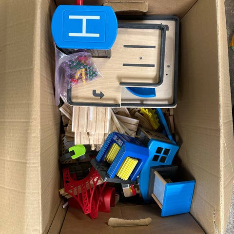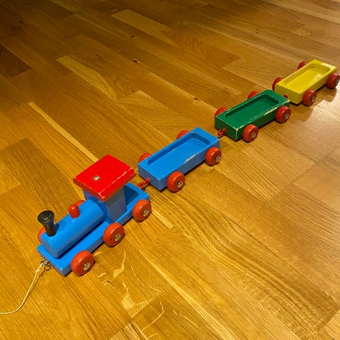 Farm Train Set barnleksak med trädelar som inkluderar tågräls, tågvagnar, byggnader och olika tillbehör i trä. Leksaken är utformad för barn och erbjuder möjligheter till kreativ lek och tågsamling.