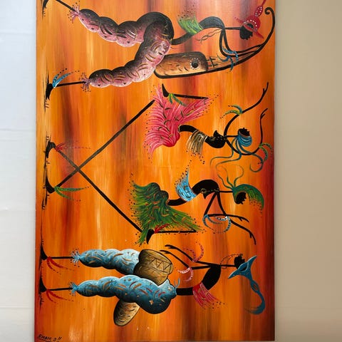 Konstverk i form av en målning som föreställer ett abstrakt landskap med bruna och röda toner samt en fallskärm i rött och vitt. Målningen är upphängd på en vägg i ett rum med trämöbler och naturligt ljus.