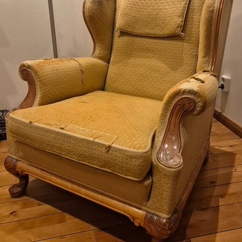 Äldre fåtöljer. Stommen intakt. Skinn i ok skick, använt men intakt. Nersuttna. Går absolut bra att använda i befintligt skick men är i behov av renovering.