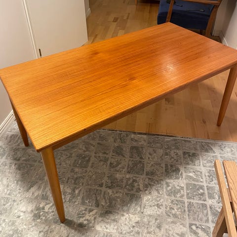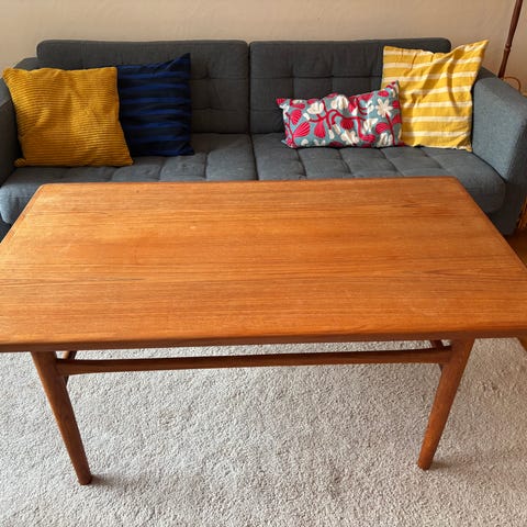 Vackert, välskött och nätt soffbord i teak. Stabilt, konformade ben. 50-tql, retro.