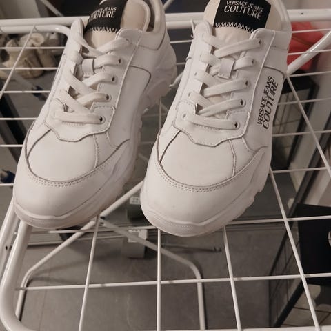 Versace skor, herrmodell. Storlek 44. Äkta läder därav lite omformade vid hälen men som ej syns när man har på sig dem. Inköpta för flera år sedan men använda några gånger, därav stått i skoförråd dock inte i låda därav lite skav. Snören helt svarta. Lejonet på bägge skor är silver.