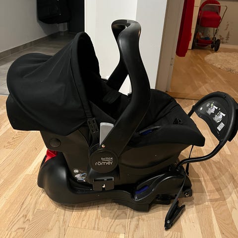 Babyskydd från Britax Römer i gott skick. Aldrig krockad, sparsamt använt av 2 barn. Fempunktsbälte, monteras lätt med bälte i baksätet men kan även användas med ISO-fix. Finns även fäste för adapter till barnvagn.